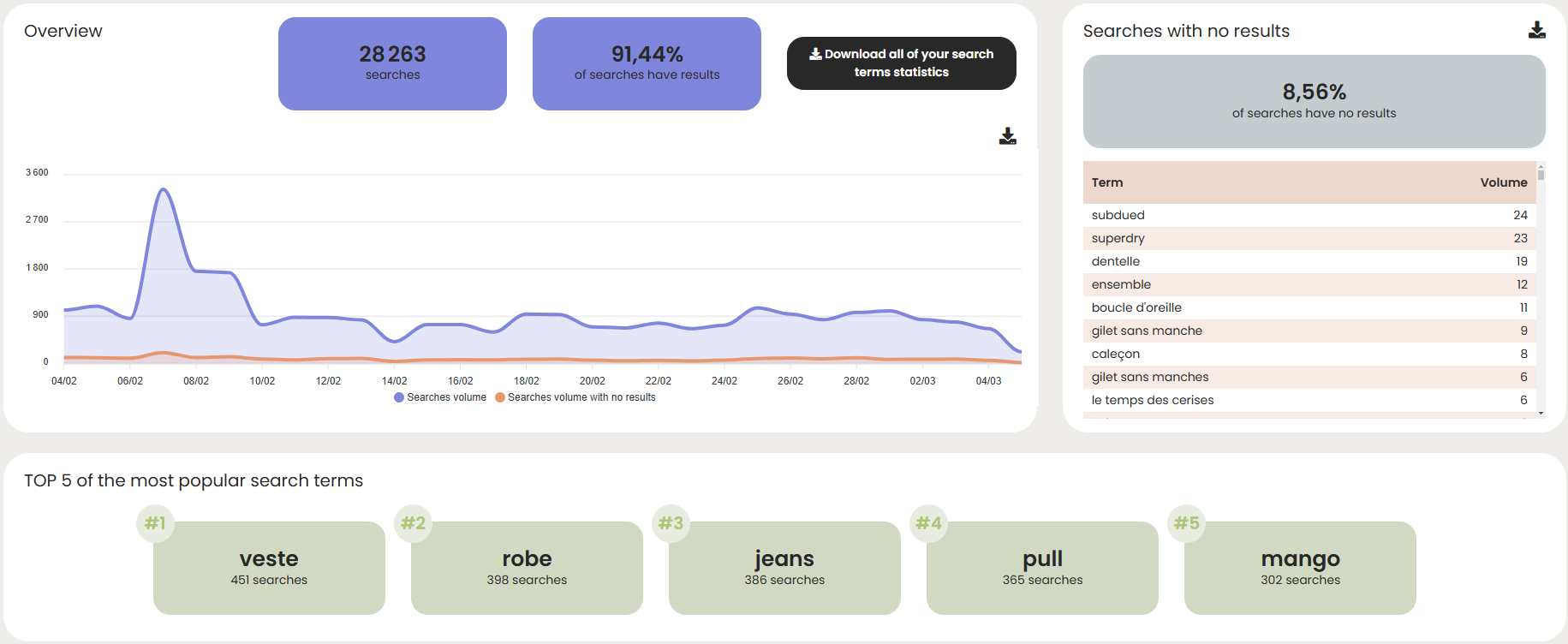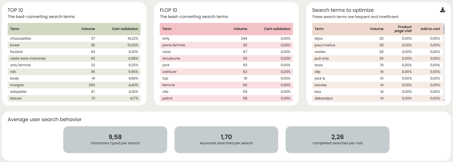 Rooms for improvement are mainly about solving 0 result that should not give 0 result, as well as keywords to optimize (few or no Product Detail Page visit from that keyword and few or no cart validation from that keyword).