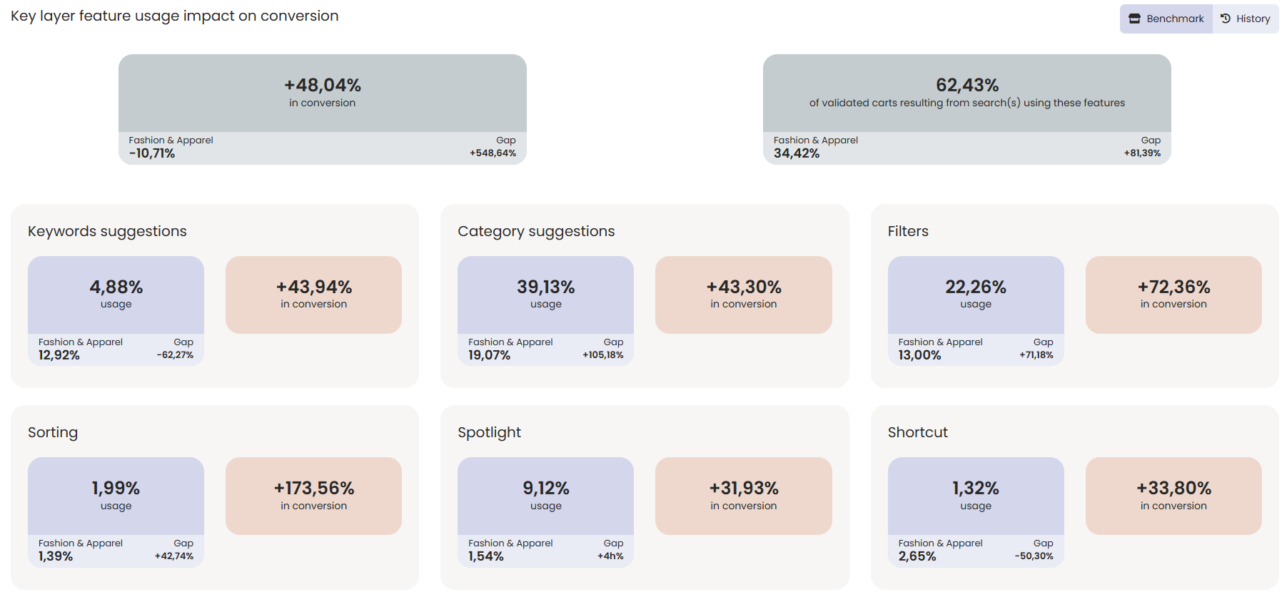 This dashboard helps you to know more about the features that your customers use, like, and the impact they have on your conversion rate, as well as ways to optimize their use.
