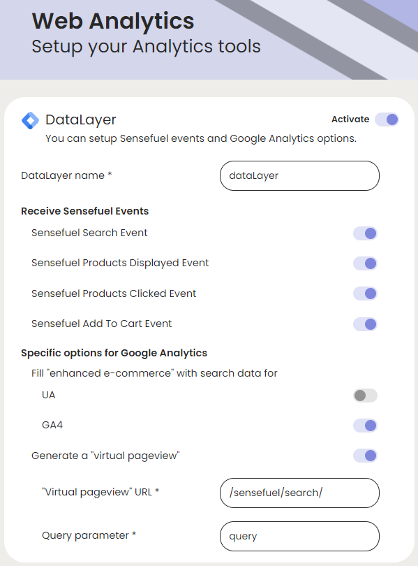 You should connect your Analytics with Sensefuel with the datalayer mode. The goal is to keep track of user’s behaviors in your own analytics tool.