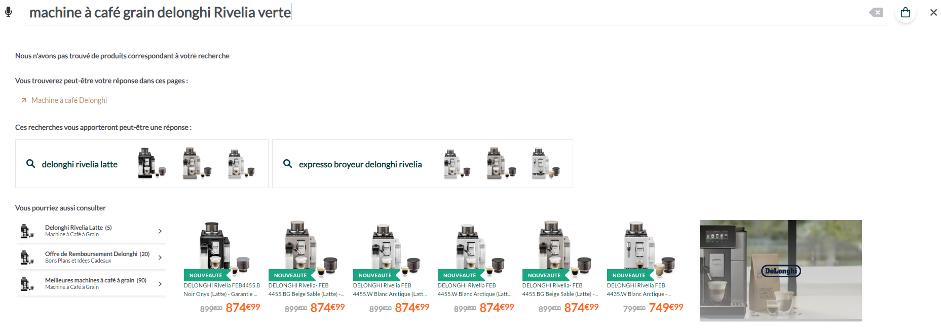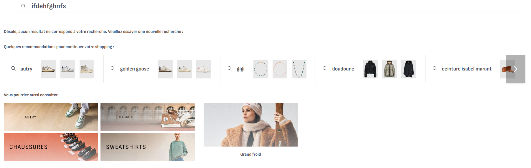 When a search returns no matching products, Sensefuel's search Layer displays a Zero Result (ZR) with suggestions in order to keep the user engaged and guide them toward relevant products or contents.