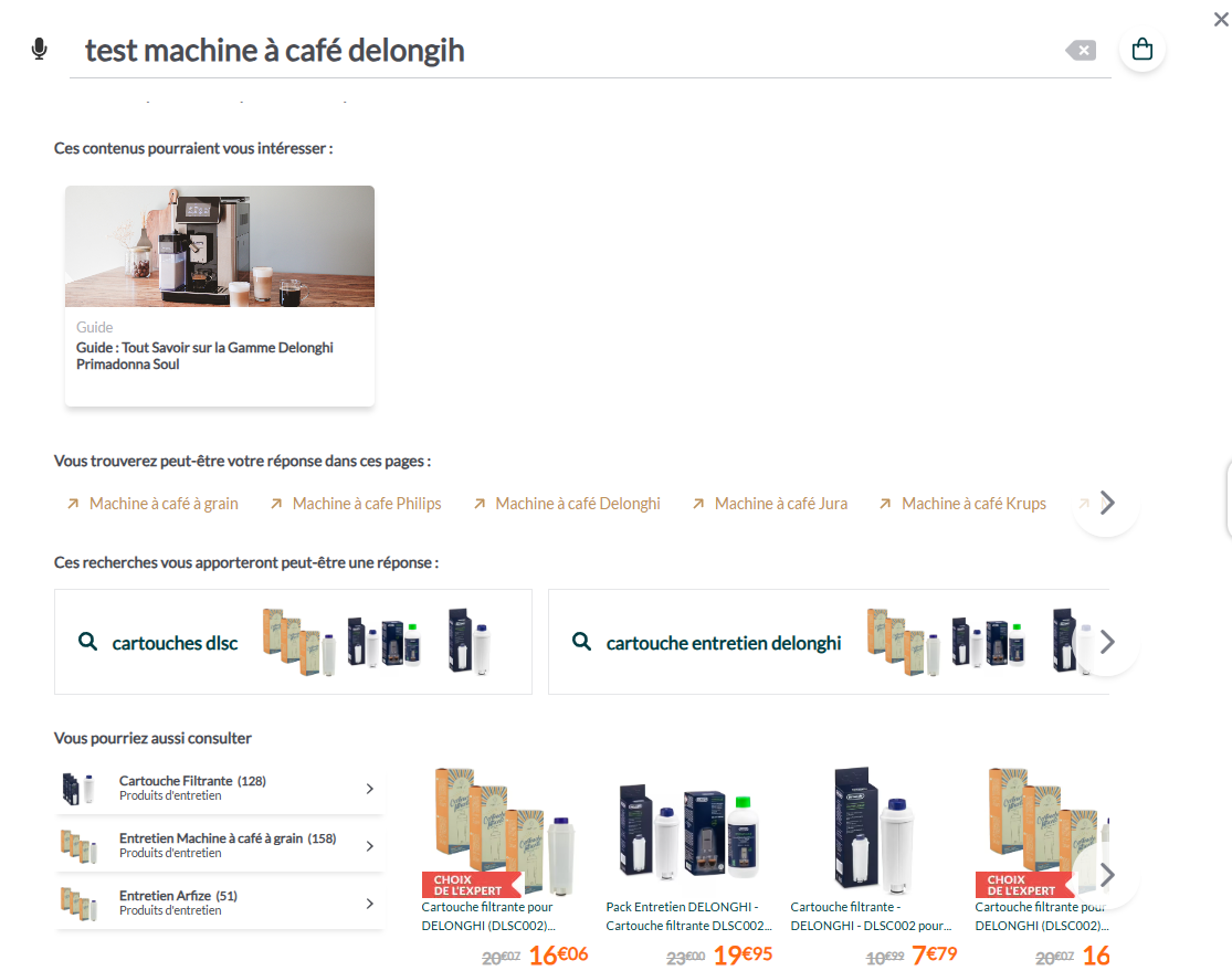 - more than 4 editorial contents : suggestions of content categories is displayed (e.g., “See 12 guides”, “See 3 news articles”). Clicking redirects in the layer to the content selection filtered by the selected category.