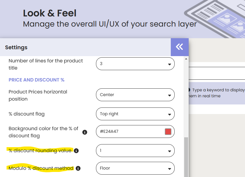 - Percentage discount rounding value : Sensefuel rounds the calculated discount rate value. The default configuration is at 5%, meaning the % of discount is rounded from 5% to 5%. Example : 5%, 10%, 15%, 20%, 25%, etc. You can change this configuration in the Look & Feel.