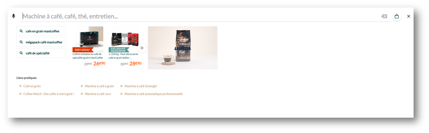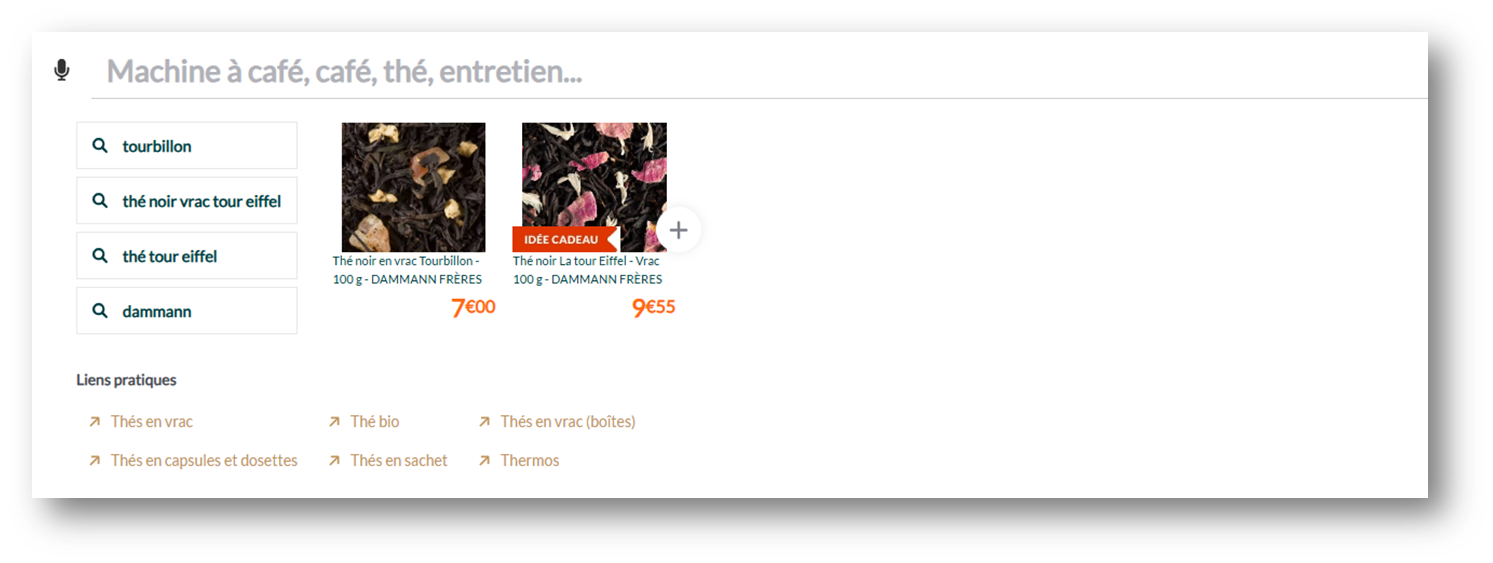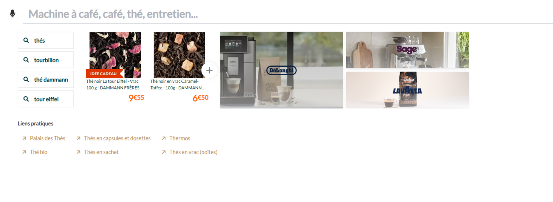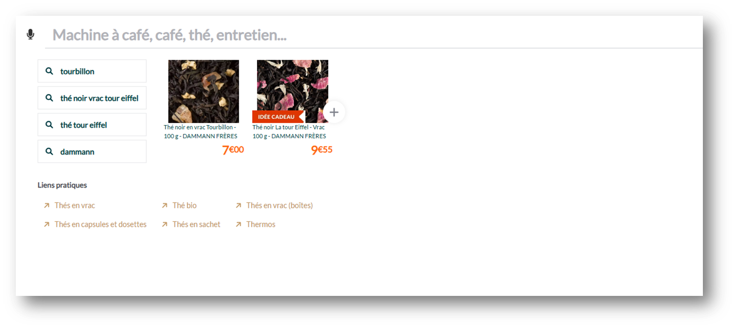 In this case, we use both the product profile and the user profile (if the user is known) to present elements adapted to the search context and the user. Priority is given to:- Expressions with a high merchandising score (calculated by Sensefuel based on events captured by our JavaScript tag and/or events propagated to our Activity Tracking API),