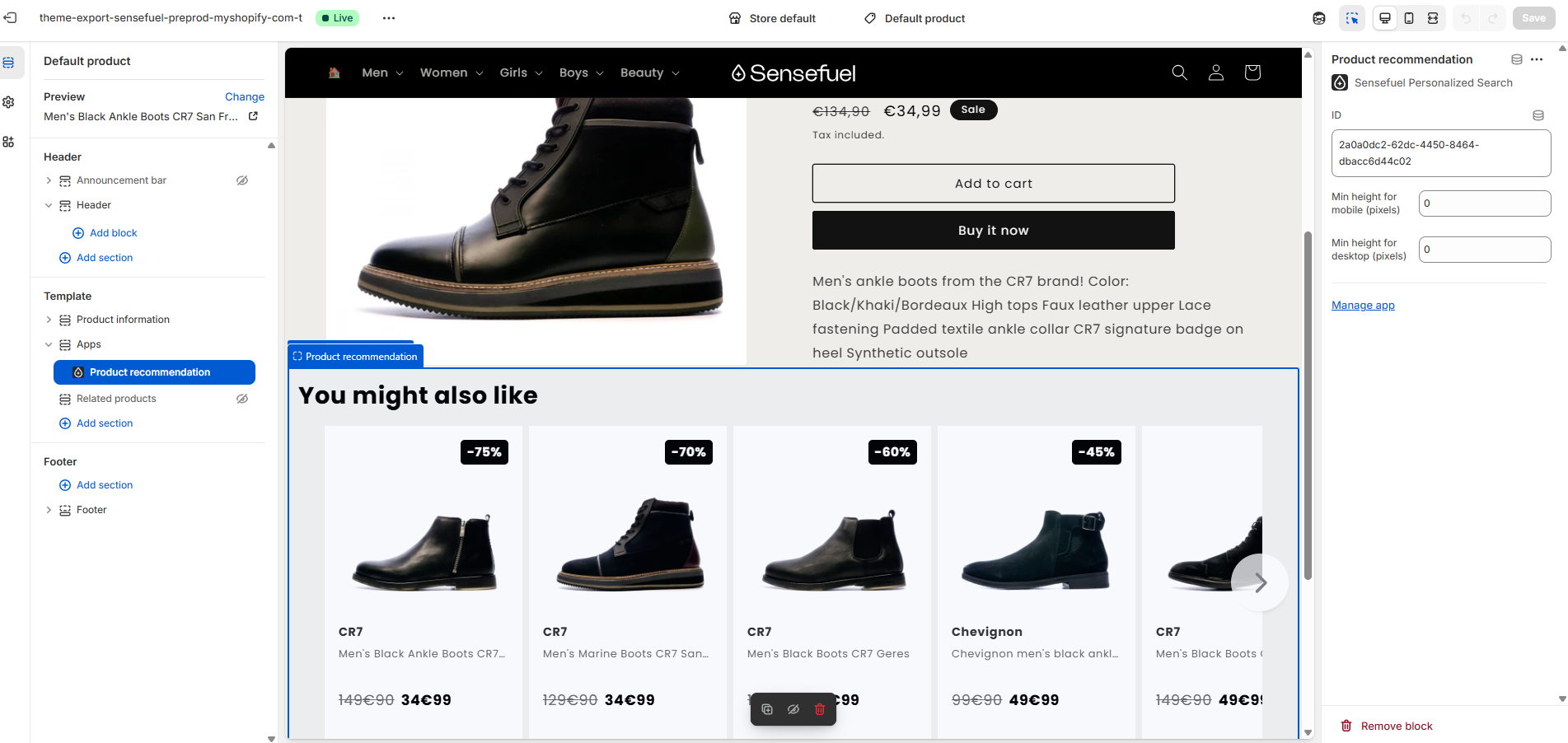 - Easily add Sensefuel’s recommendation snippets into your Shopify theme by adding a Sensefuel recommendation section and inserting the recommendation slot ID from your configuration in Sensefuel's platform.
