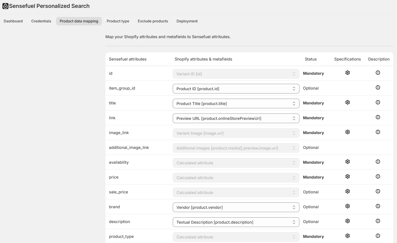 - The app extracts your Shopify product catalog and generates a CSV file. As a user you can select and map your Shopify attributes, metafields, options, tags, etc. to enrich the feed with additional data.